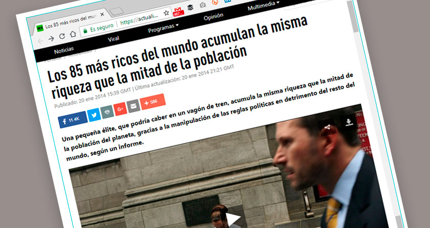 Conforme al informe publicado por la organización Oxfam, las élites ricas se reparten el poder político para manipular las reglas del juego económico, socavando la democracia y creando un mundo en el que las 85 personas más acaudaladas acumulan tanta riqueza como la mitad de la población del planeta junta.