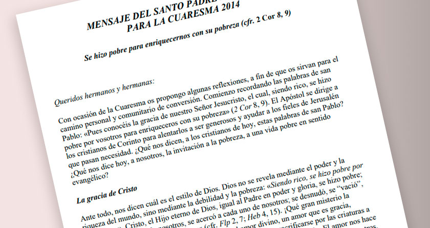 Se dio a conocer el mensaje del Papa Francisco para la Cuaresma 2014, el primero de su pontificado para este tiempo de la liturgia de la Iglesia, que ha titulado “Se hizo pobre para enriquecernos con su pobreza” (cfr. 2 Cor 8, 9).